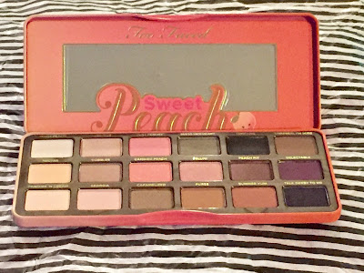 Of course after I was through perusing the foundations the eye shadow palettes caught my eye next. And the one I chose was an oldie to some but a new one to me - the Too Faced Sweet Peach Palette. This palette comes with 18 creamy shadows in varying shades of coral, pink, green, purple, brown, and black. And the whole thing smells like a peach. Who doesn't love that?